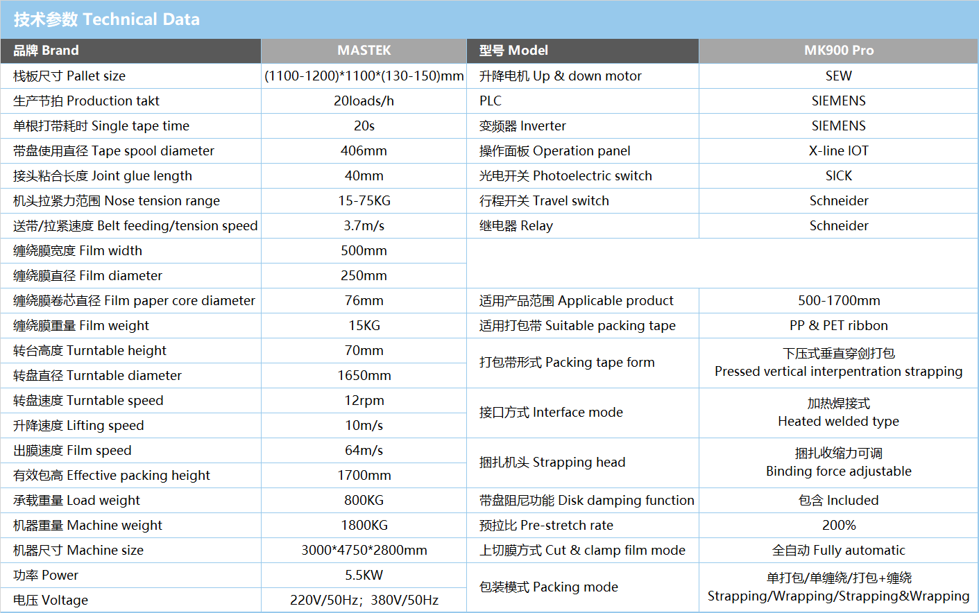 MK900 Pro打包纏繞一體機,由一臺全自動棧板打包機與一臺纏繞機組合而成,兩者共用一個轉(zhuǎn)盤,實現(xiàn)打包、纏繞一體完成。MK900 Pro打包纏繞一體機主要適用于場地不是很大的客戶。由于是二合一的設(shè)備,會節(jié)省使用空間!